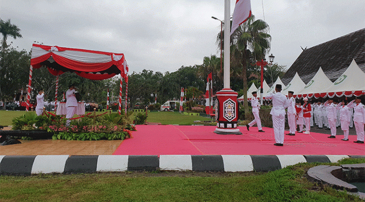 Walaupun hujan, Pasukan Pengibar Bendera (Paskibra) Kabupaten Kotawaringin Timur tetap sukses melaksanakan tugas dan kewajibannya mengibarkan sang saka merah putih.